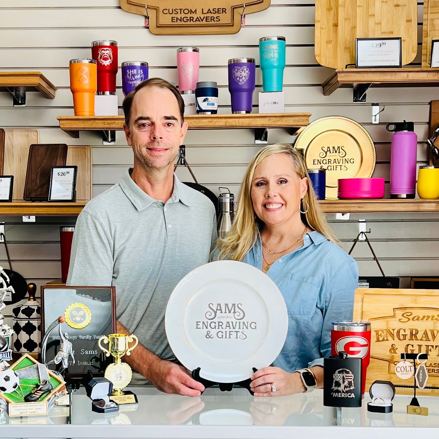 Sams Engraving & Gifts is located in Athens, GA and is owned and operated by native Athenians, Matt and Holly Sams. We specialize in a variety of custom creations, including Personalized Keepsakes, Trophies & Awards, and Business Promotional Items. Whether you select from one of our designs or share your own vision, we are dedicated to crafting one-of-a-kind, laser-engraved pieces that perfectly match your needs.