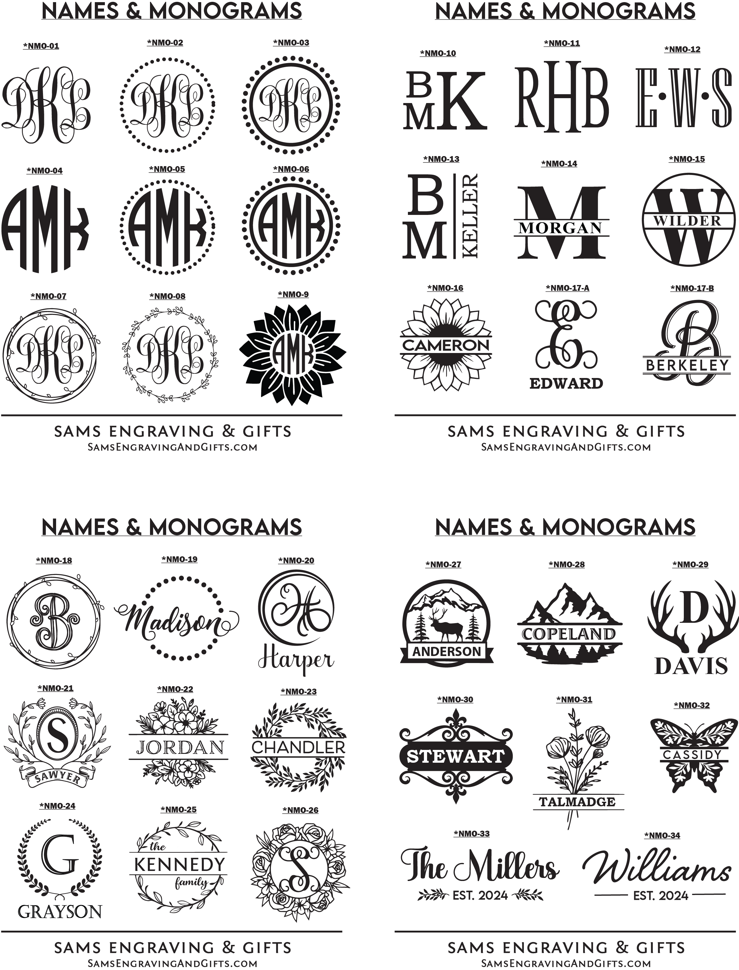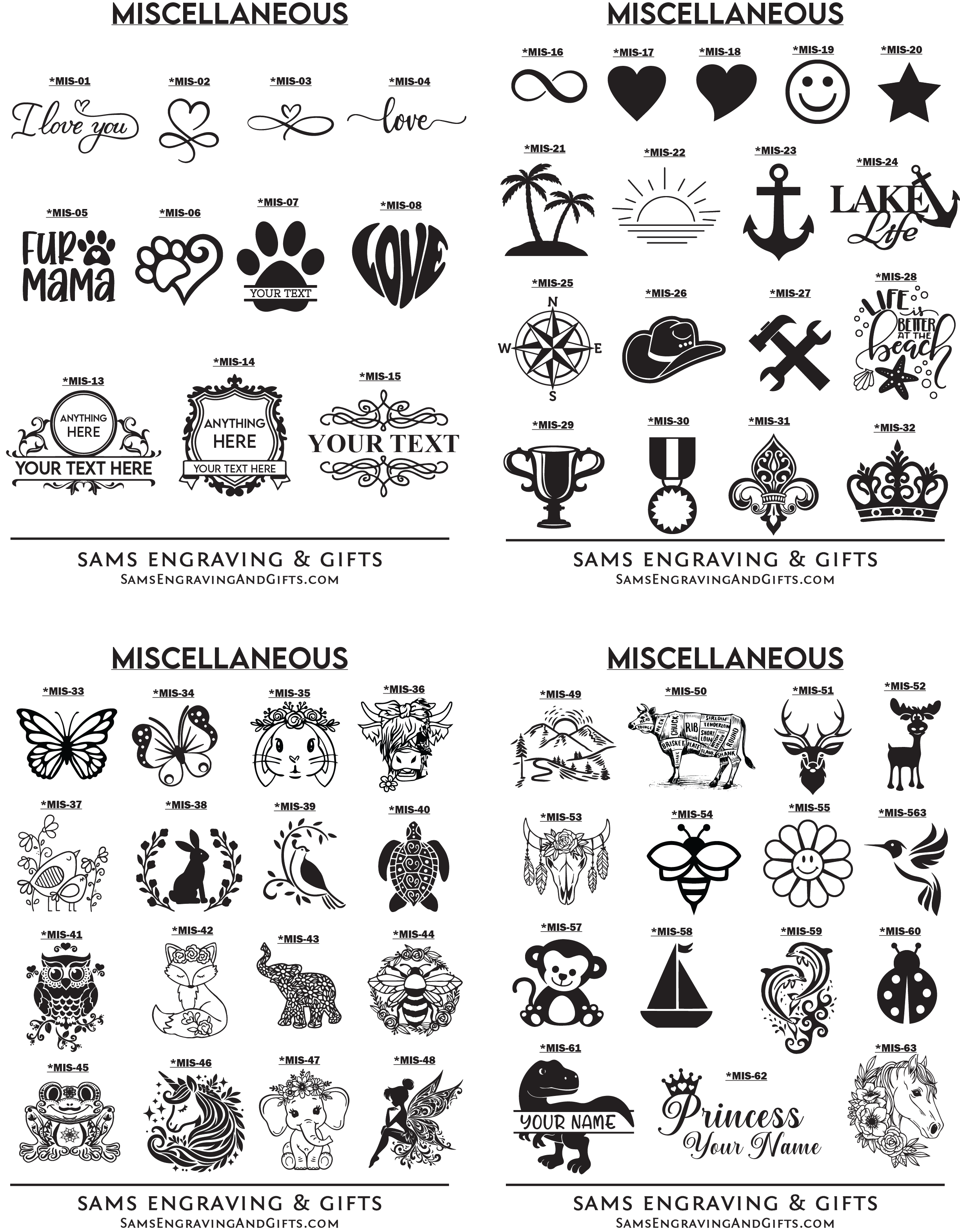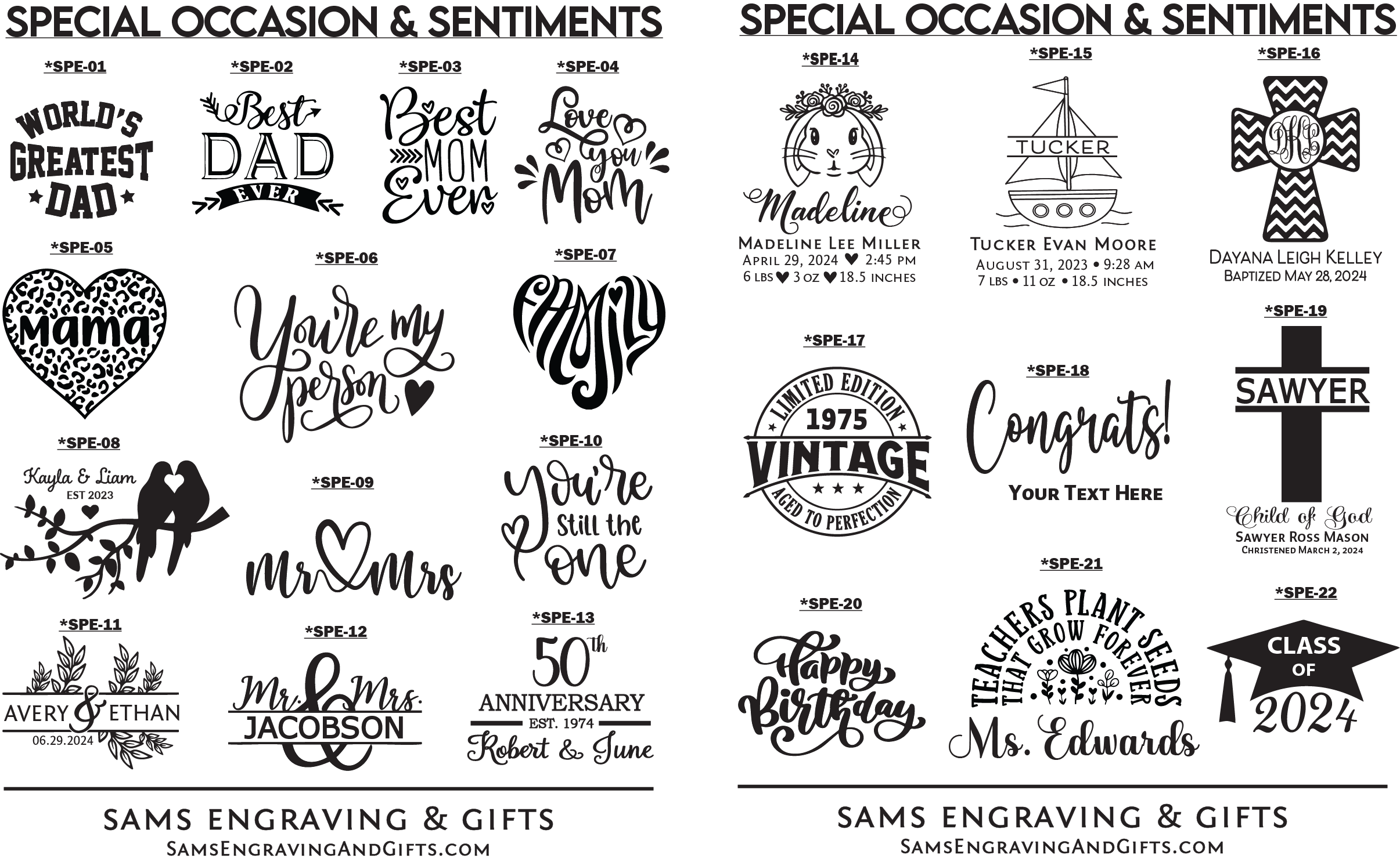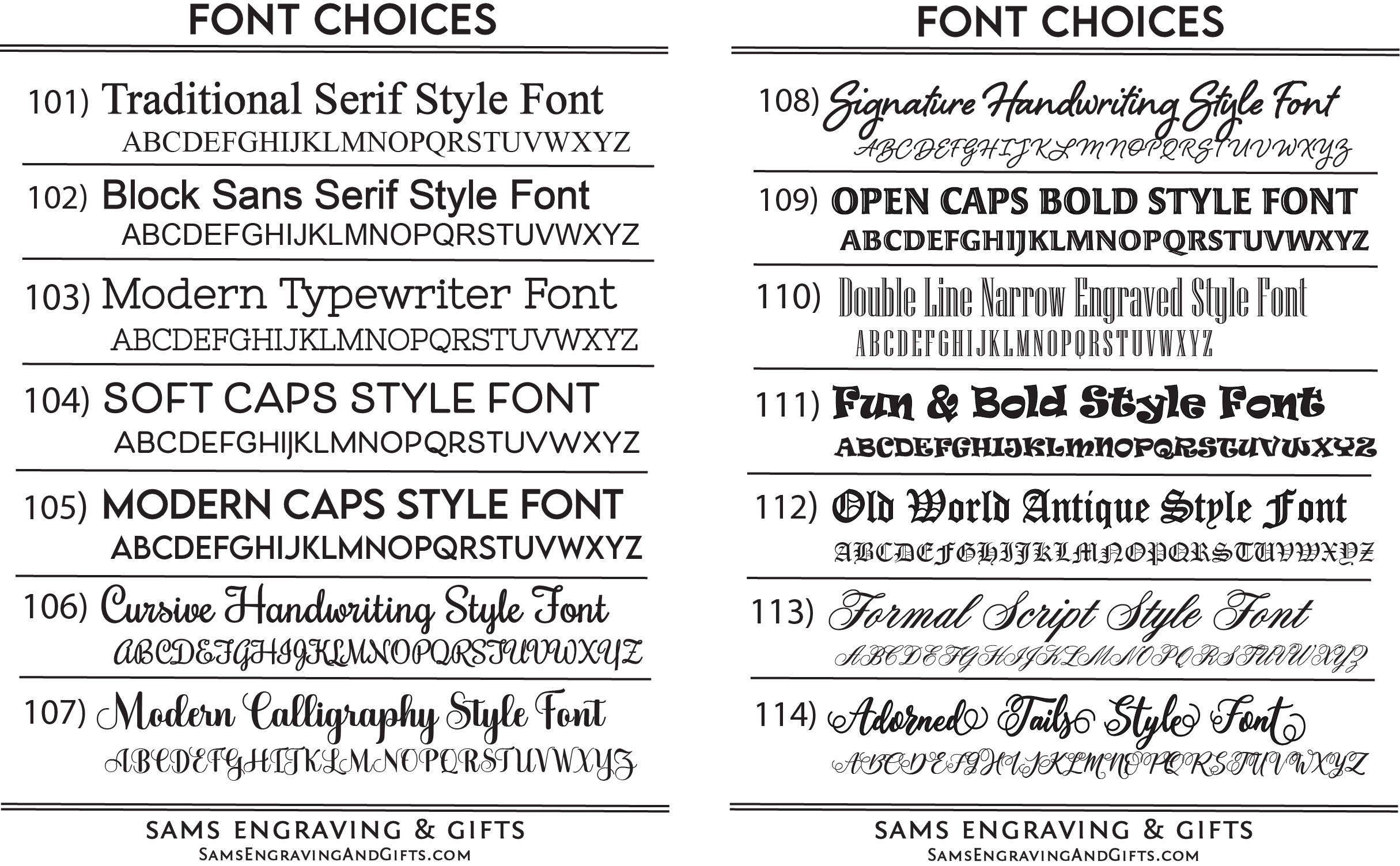 Designs can be personalized with your information on any of our products. Please select your desired font and/or design choice. Enter your selection number(s) in the "Personalization Box" when you check-out. You can also upload your own design/logo. *If images below are blurred, try using a different browser or view on a mobile device. Please contact us if you experience any issues.