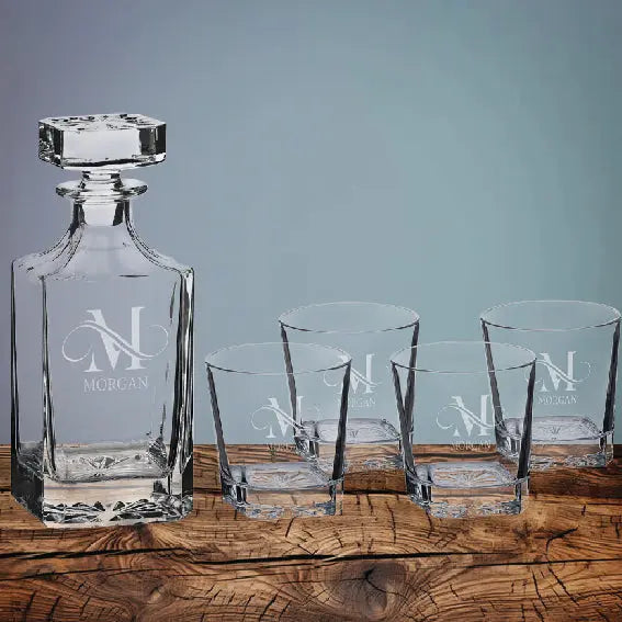 This stunning square glass decanter set features an 850ml square decanter with stopper lid and four matching 11 oz. squared rocks glasses. Each piece—the decanter, lid, and glasses—can be custom engraved with the same monogram, logo, or design to create a unified, personalized gift. Packaged securely in a durable gift box with EVA foam protection, this set is perfect for weddings, corporate gifts, retirements, or special celebrations.